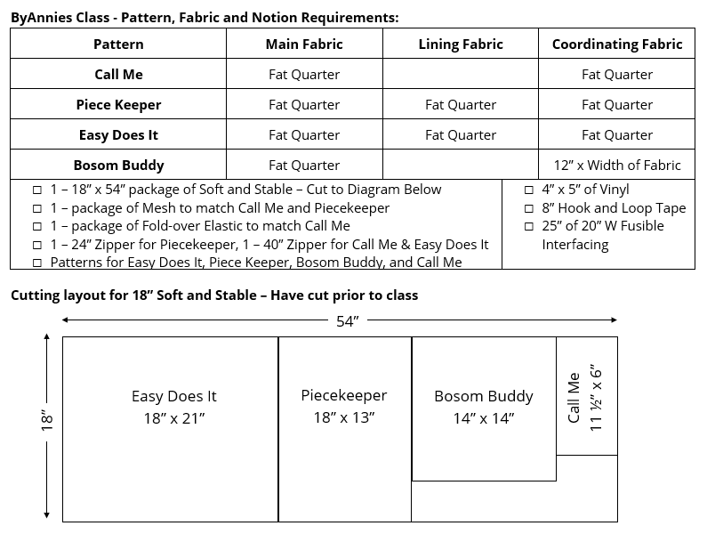 This ByAnnie Basic class works through all the techniques needed to make a ByAnnie project from start to finish. You will learn how to prepare, quilt, cut, sew, press and assemble your project. Using the patterns Piece Keeper, Call Me, Easy Does It and Bosom Buddy you will learn how to insert a zipper, make strapping, use hook and loop tape, mesh, fold-over elastic and vinyl, and work with bias binding. All fabrics, notions and tools are required prior to the first class.