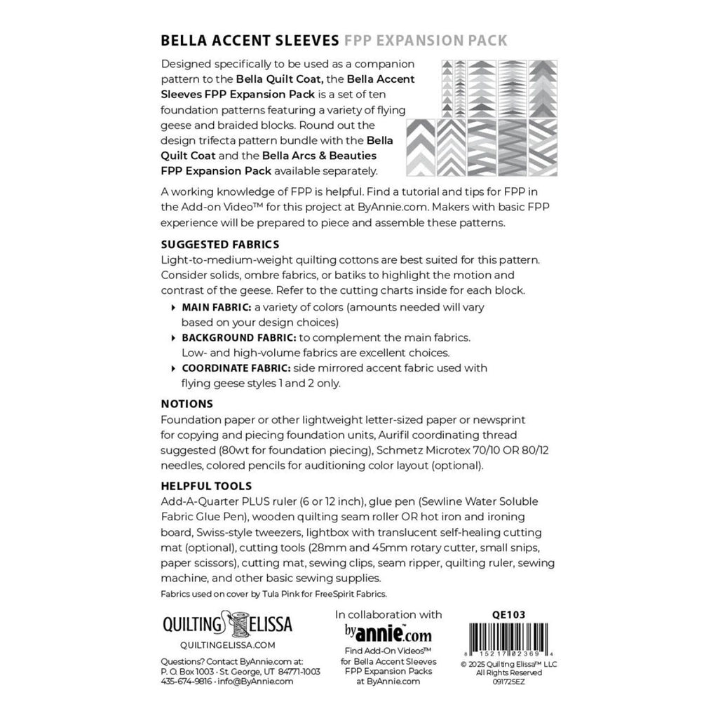 The Bella Accent Sleeves FPP (foundation paper piecing) Expansion Pack is designed specifically to be used as a companion pattern to the Bella Quilt Coat.