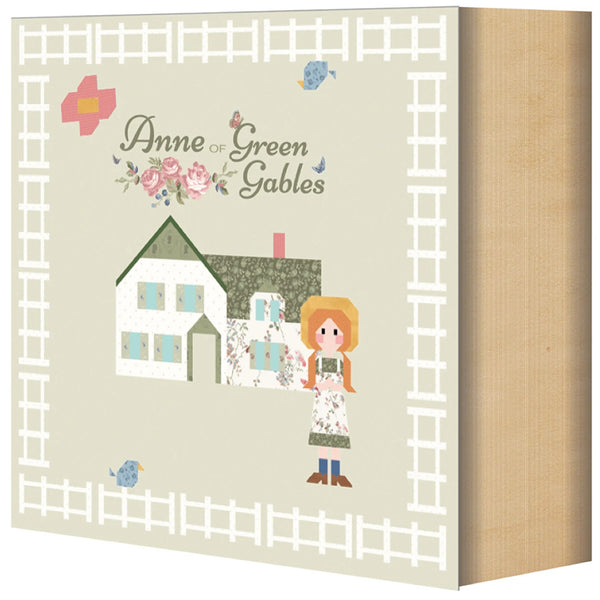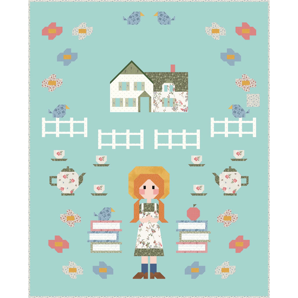 This charming quilt kit features a delightful design inspired by the classic story "Anne of Green Gables." The central theme showcases Anne Shirley with her iconic red braids, standing in front of the beloved Green Gables house. Surrounding this central image are playful elements like birds, flowers, teapots, and books, all set against a soft teal background, creating a whimsical and nostalgic scene. The kit includes everything needed to craft this enchanting quilt, perfect for fans of the story or anyone who loves vintage-inspired designs.
